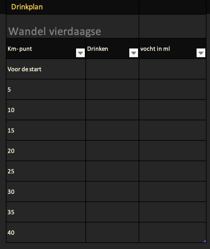 Drinkplan voor bijv. de Marbella 4Days Walking
